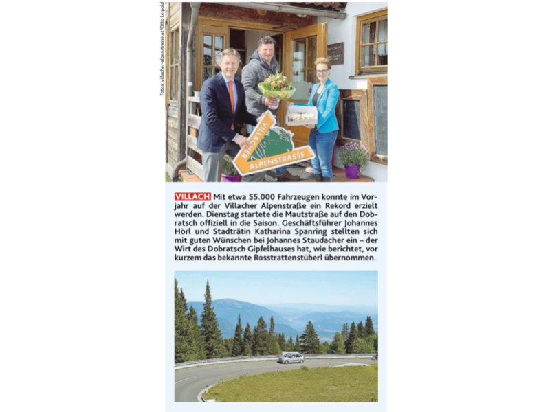 VILLACH Mit etwa 55.000 Fahrzeugen konnte im Vorjahr auf der Villacher Alpenstraße ein Rekord erzielt werden. Dienstag startete die Mautstraße auf den Dobratsch offiziell in die Saison. Geschäftsführer Johannes Hörl und Stadträtin Katharina Spanring stellten sich mit guten Wünschen bei Johannes Staudacher ein – der Wirt des Dobratsch Gipfelhauses hat, wie berichtet, vor kurzem das bekannte Rosstrattenstüberl übernommen.